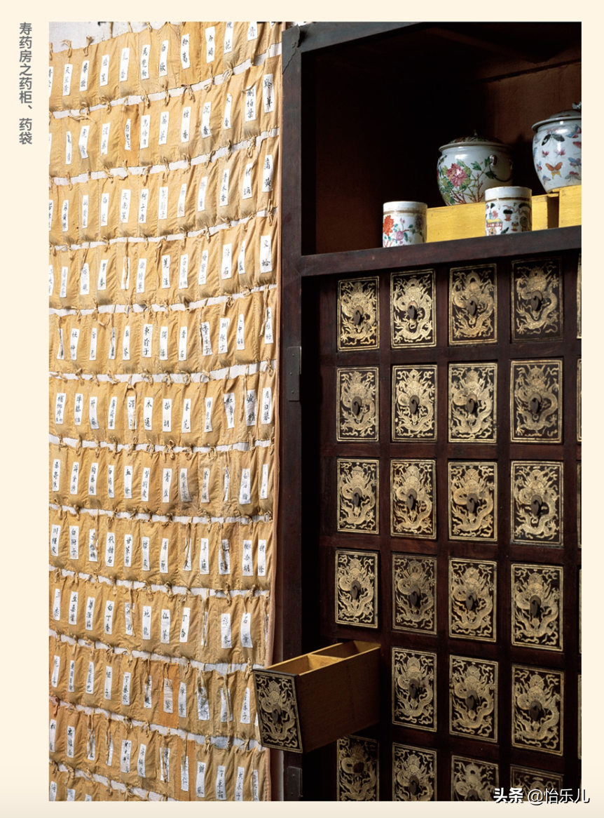 现仍称寿药房的有两处,一是坤宁宫后端则门南屋,一是北五所西第二所,至今医药库房内还收藏有当时寿药房陈设和使用的药柜、各种中成药、丸散膏丹,还有出巡时使用的大药袋,各种制药、吃药及医疗工具。