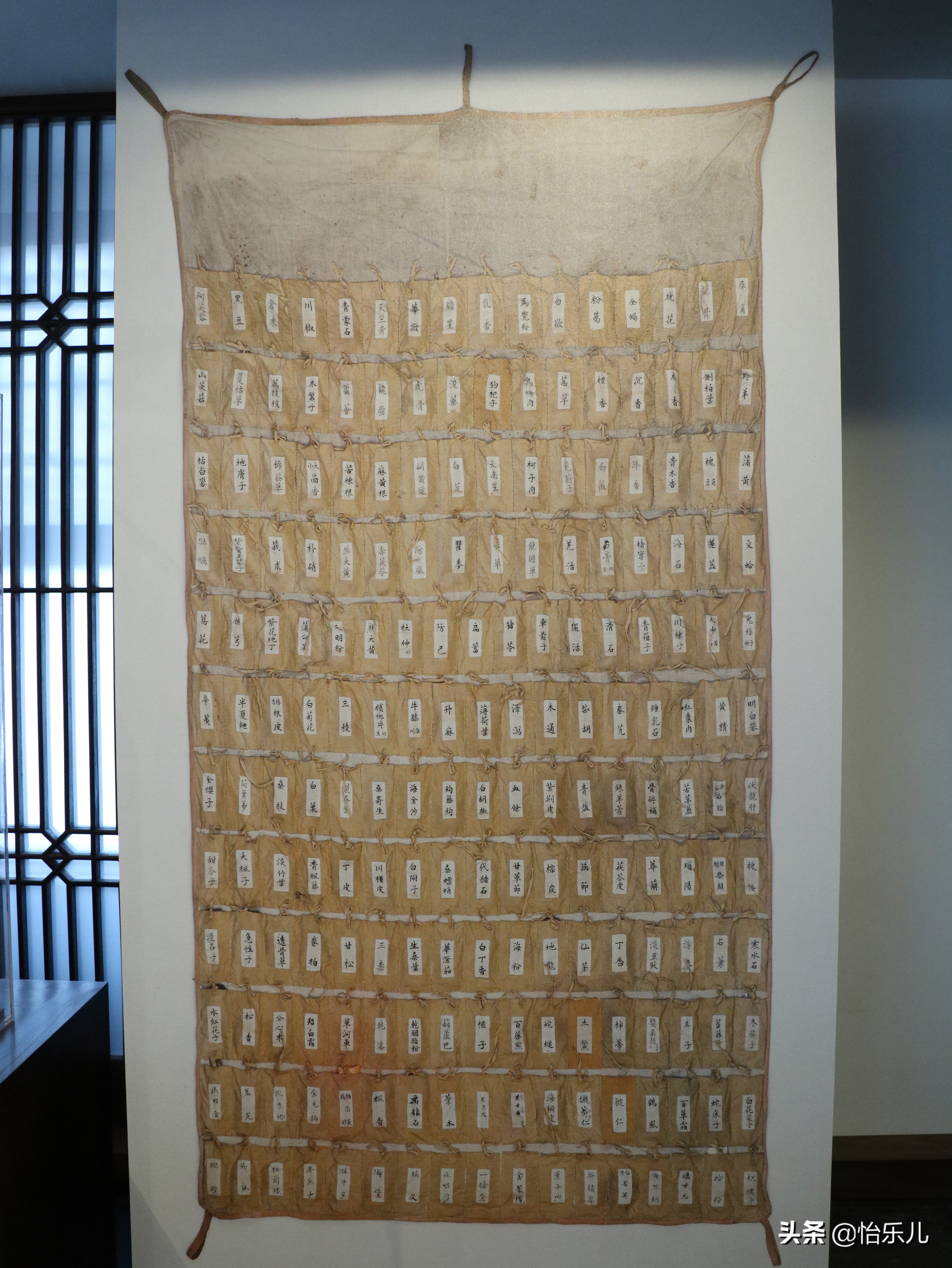 大药袋为黄绸制成,上缝有100多个小袋,内装中草药,小袋表面贴有药名的白纸标签,以防混淆。