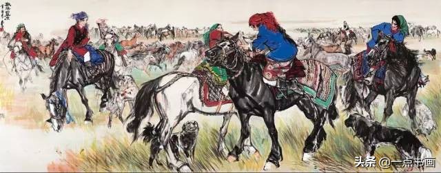 简介:绘制于1981年,表现的是新疆柯尔克孜族人民正在进行传统体育项目一一“马上较力”的活动场面。画面描绘了七位女性人物、九条牧羊犬、七十多匹骏马,如此众多的表现对象,画幅尺寸达到惊人的46平尺。如此精彩的巨幅作品在黄胄的绘画生涯是非常少见的。