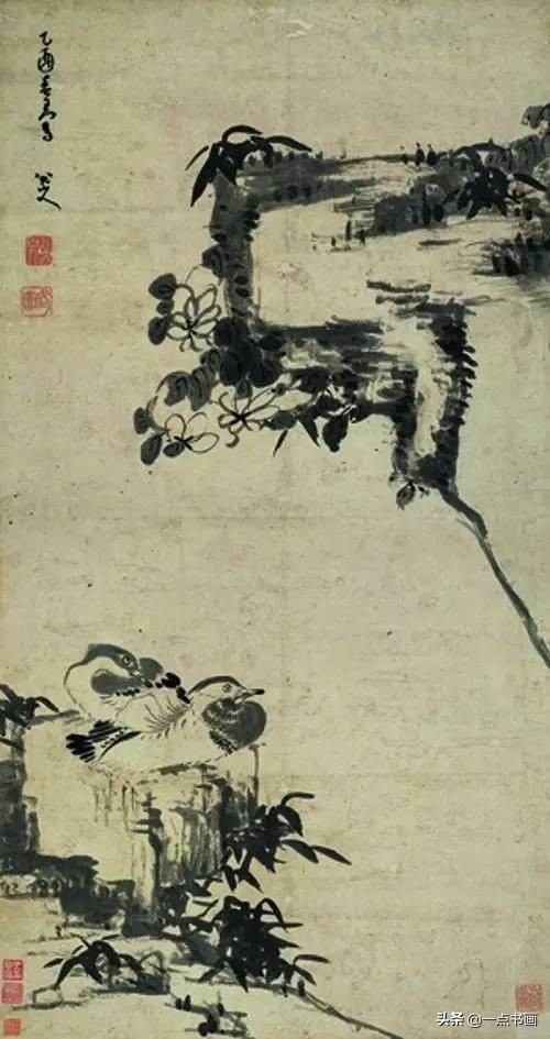 简介:这件作品是八大山人去世之年所画,代表他风格最成熟圆融的阶段。八大山人用墨笔作于明代灰纸上,在构图上采取了对角倚斜之势,上留天头,下着斜坡,图左下角两鸳鸯依偎于巨石之上,右上则是巨石芙蓉,看起来两相呼应,颇有野趣。