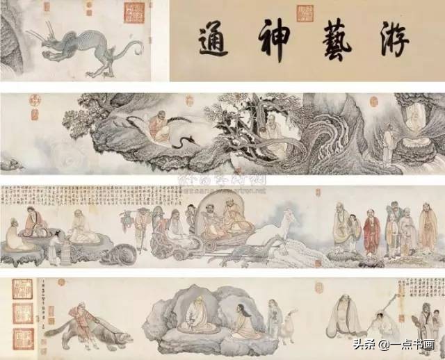 简介:该图十八应真的造型,画得惟妙惟肖,很是逼真,乾隆皇帝恭楷亲题引首:“游艺神通”四字,并赋七言古风长诗一首,题于画卷之上,垂爱之情溢于言表。吴彬的作品传世稀少,已入清宫内府并著录在《石渠宝笈》、《秘殿珠林》的总共18件,得乾隆皇帝亲笔题字者,仅此一件。