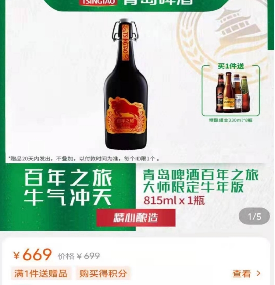 近日,青岛啤酒更是极为疯狂,居然推出了单支啤酒售价在699元,这比华润啤酒单支啤酒500元还要高。据了解到这款青岛啤酒名为“青岛啤酒百年之旅·大师限定牛年版”,无论是互动价还是网上价格,都以单支699元卖出。很多人想不明白,一支啤酒为什么要卖这么贵,难道现在收藏啤酒的价值已经大过了白酒价值吗?