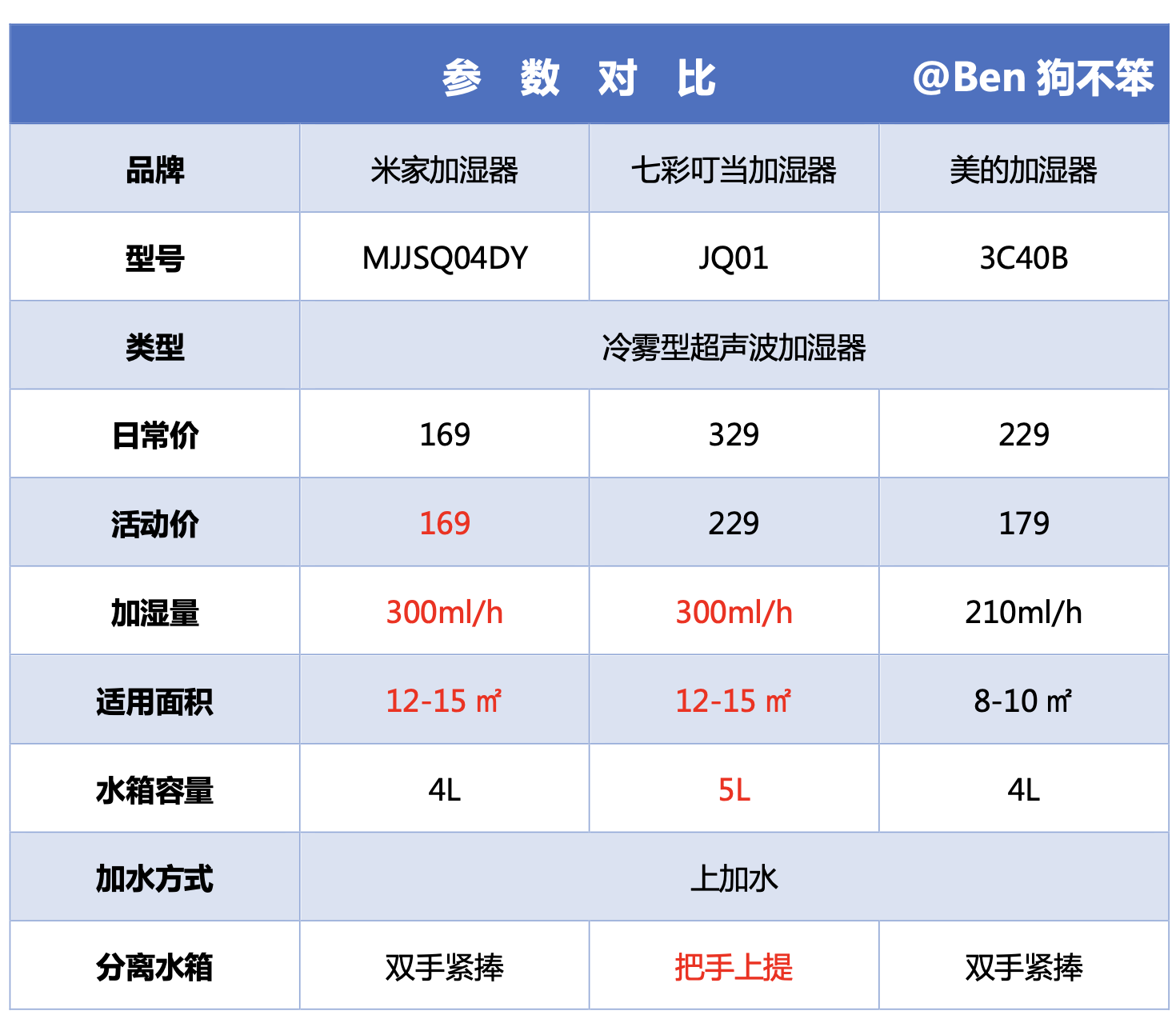 作为一名标准的理工男,当然少不了对参数进行一番对比了,下面是我整理的这三款加湿器的参数对比表,感兴趣的话可以保存下来。