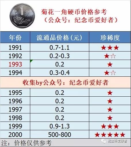 关于菊花一角硬币的收藏价值,小爱总结了一张价格表,和大家一起分享: