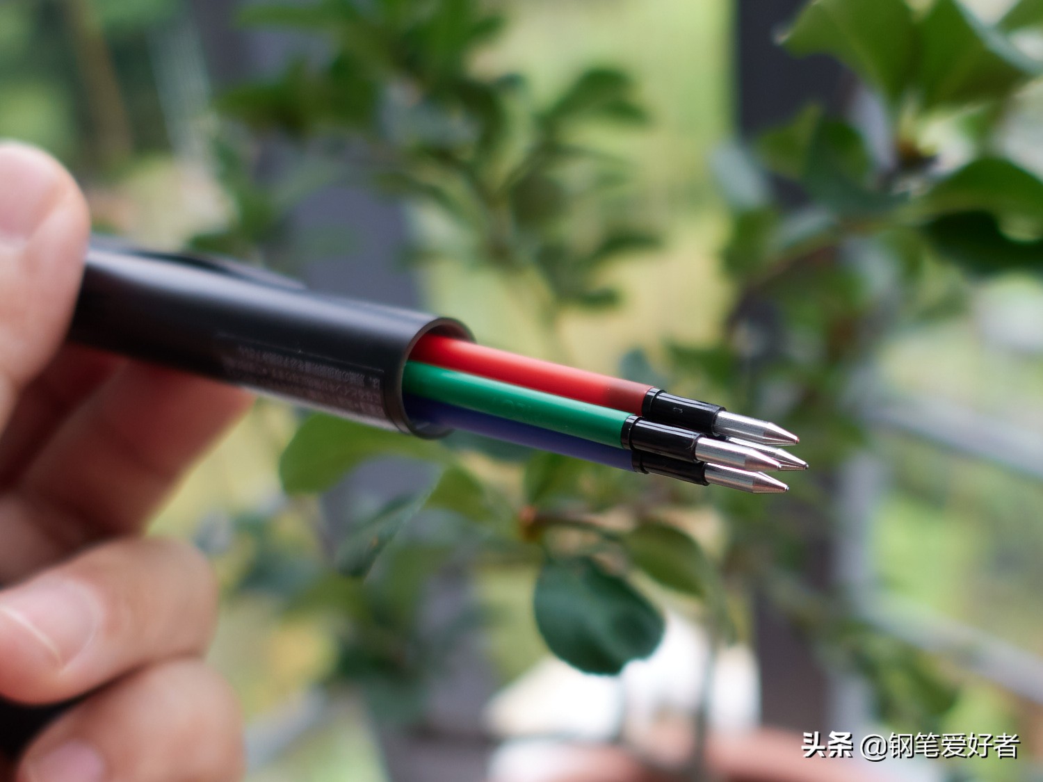 这种四色笔芯设计,倒不稀奇。最上面那个黑色的球球,其实是个橡皮擦。一共有黑色(准确地说是深灰色)、蓝色、绿色和红色。