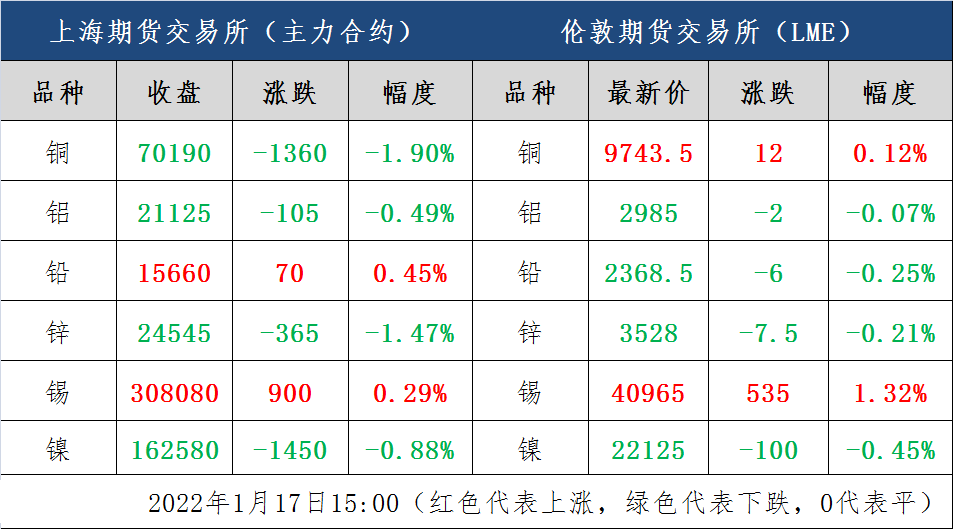 开年以来,由于美联储加息预期以及疫情等因素影响,美股开局糟糕。前段时间,金属涨势不错,短期金属转入大涨之后调整环节,日内基本金属跌多涨少,其中沪铜收跌1.9%,领跌金属,沪锌跌1.47%紧随其后,沪镍跌幅低于1%,沪铝收跌约0.5%,而沪铅及沪锡涨幅均不及0.5%。中国春节前后,市场需求转弱,而厂家产量持续;加上美联储议息会议临近构成宏观利空预期,中短期金属或呈弱运行。